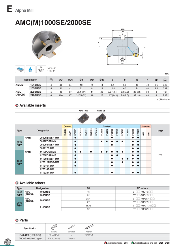 – Đài dao phay Alpha Mill, góc lưỡi cắt 75°, phay khỏa mặt đầu.