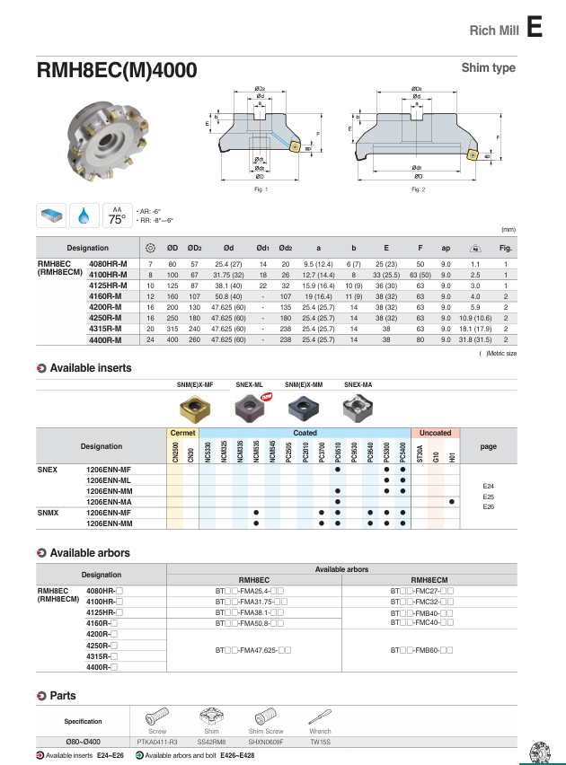 – Đài dao phay Rich Mill, góc lưỡi cắt 75°, có tấm đệm thay thế