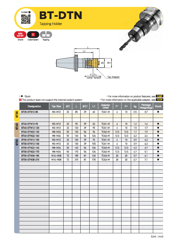 – Đầu kẹp taro BT-DTN có thể hỗ trợ dải gia công từ M3 đến M38 bằng cách thay thế adapter taro.