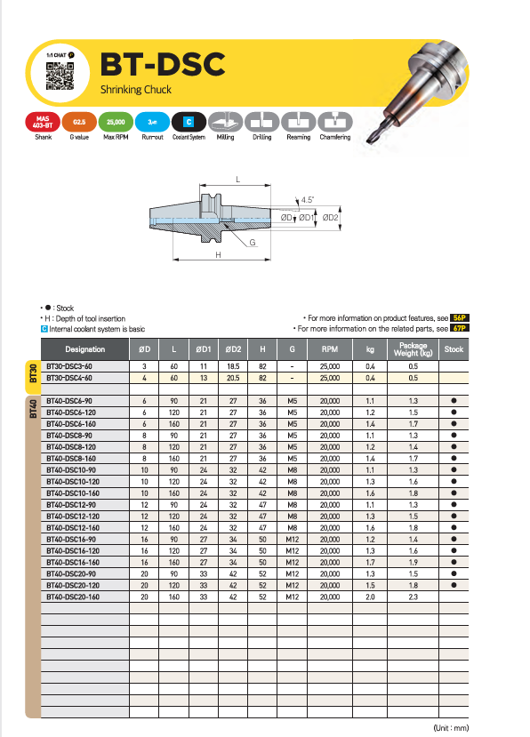 – Dòng sản phẩm đầu kẹp nhiệt BT-DSC được thiết kế thân mảnh, chuyên dụng cho gia công rãnh sâu trên máy CNC 5 trục