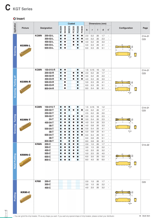 – Mảnh dao tiện cắt rãnh KGT, 2 cạnh cắt, dùng cho cắt rãnh nhẹ.